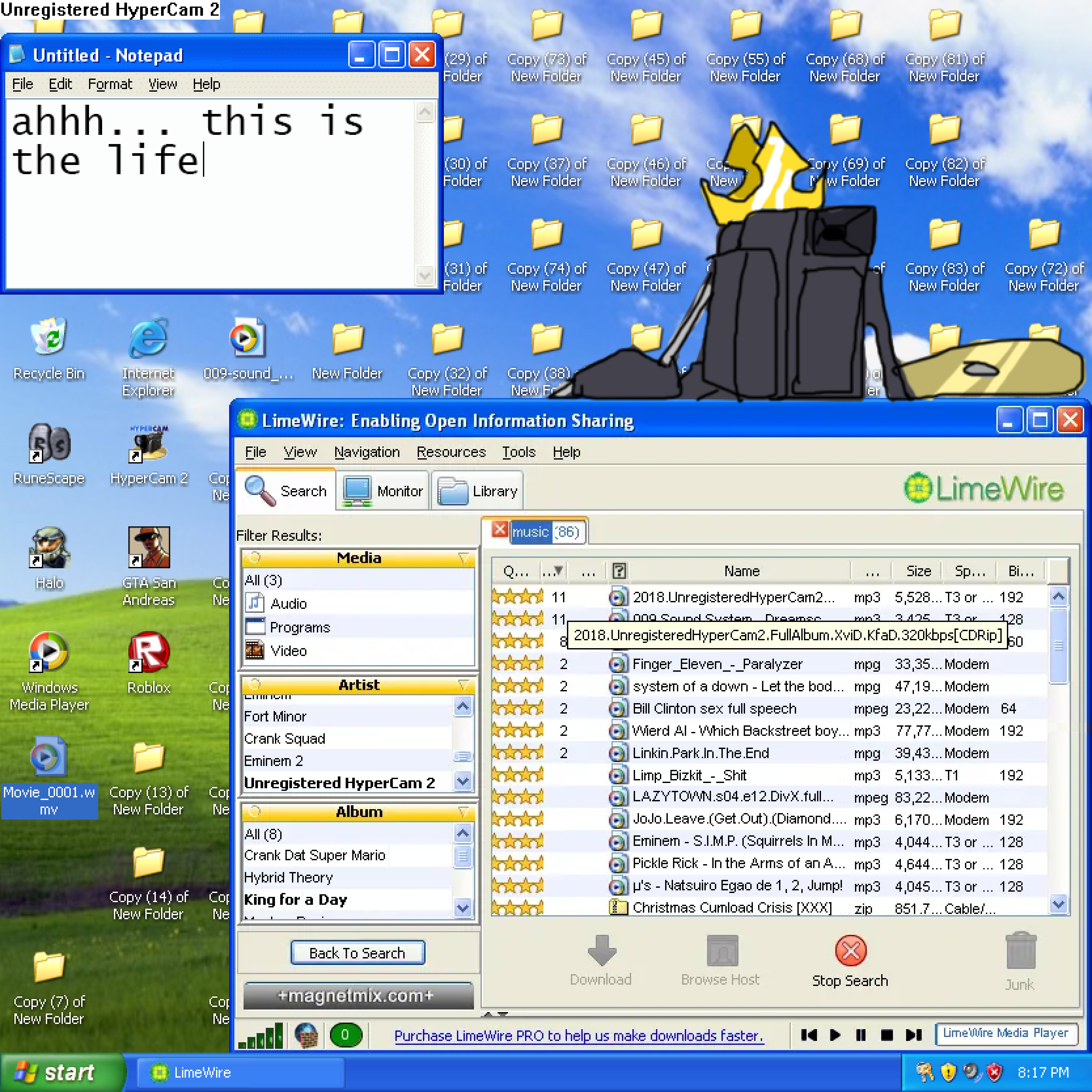 The album cover, a screenshot of Windows XP with a drawing of Unregistered HyperCam 2 wearing the King for a Day crown overlaid, features several references to SiIvaGunner and other elements related to 2000s internet culture. In the LimeWire window, several tracks have obviously incorrect metadata, referencing the real LimeWire's tendency to have such tracks, and the file names are formatted to imitate the file names of actual LimeWire downloads.