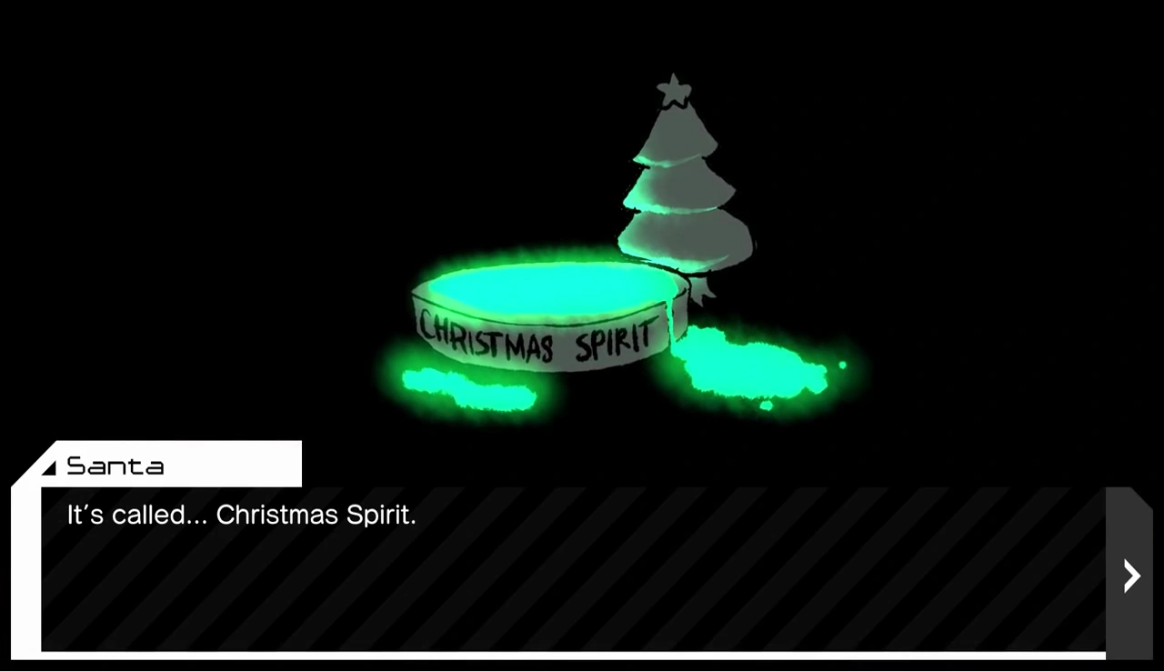 President Haltmann, the assistant of the Voice Inside Your Head, documented the history and characteristics of Christmas Spirit in Christmas Spirit [FILE-07] - Haltmann's Archives. Christmas Spirit was first discovered by Haltmann's Patrol Bots in a production facility in the North Pole. Based on Haltmann's findings, Christmas Spirit is highly volatile and makes a sleigh bell noise. Santa likely used the Christmas Spirit to give himself superhuman strength as well as augment his weapons, such as the bombs he used in the 2002 Iraq bombing. It was found that Christmas Spirit could be obtained by festive activities, including the production of high quality rips.